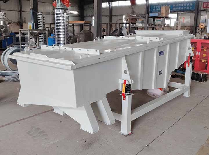 直线振动筛的外形像一个平放的长方体,筛面呈水平或略带倾斜角度,可以倾斜的角度在0°-15°。运作时两侧的振动电机驱动物料沿筛面跳跃式前进。这种结构适合粗筛场景,例如将1毫米粒径的粗砂分成三到四个规格。一台1.2米宽、3米长的直线筛,处理金刚砂粗料时每小时筛分量在2吨到3吨之间。