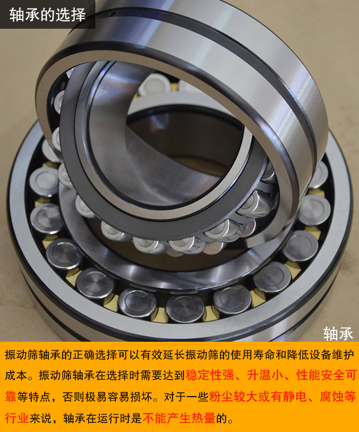 振动筛轴承是将电机动能传递到筛面的重要部件,通过轴承的转换才能使筛面做出不同形式的垂直、水平、倾斜的三维运动,从而实现分级、过滤、除杂等筛分工作。振动筛轴承在选择时需要达到稳定性强、升温小、性能安全可靠等特点,否则极易容易损坏。对于一些粉尘较大或有静电、腐蚀等行业来说,轴承在运行时是不能产生热量的,温度太高对轴承伤害较大,影响振动筛正常运作。由此可见,振动筛轴承的正确选择可以有效延长振动筛的使用寿命和降低设备维护成本。
