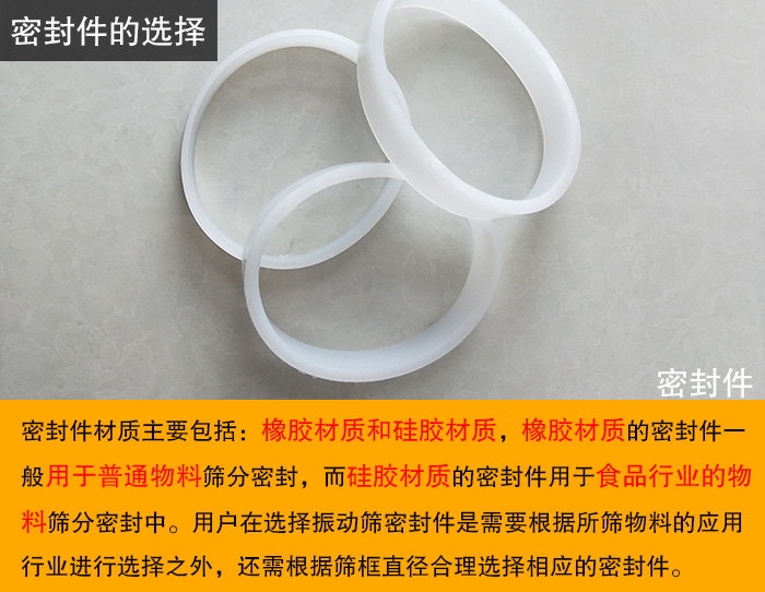 密封件是振动筛设备中必不可少的密封配件,根据振动筛筛分物料的不同,密封件材质的选择也是不同的。密封件材质主要包括:橡胶材质和硅胶材质,橡胶材质的密封件一般用于普通物料筛分密封,而硅胶材质的密封件用于食品行业的物料筛分密封中。新乡大汉密封件还有其他材质及型号可供用户选择,还可支持特殊型号的定做。所以用户在选择振动筛密封件是需要根据所筛物料的应用行业进行选择之外,还需根据筛框直径合理选择相应的密封件。