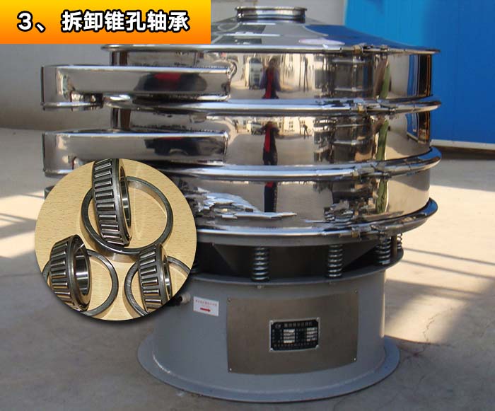 重型振动筛轴承的内圈拆卸采取油压法。经过安装正在轴上的油孔加以油压,以使易于拉拔。幅度大的轴承则油压法与拉拔夹具并用,停止拆卸工作。